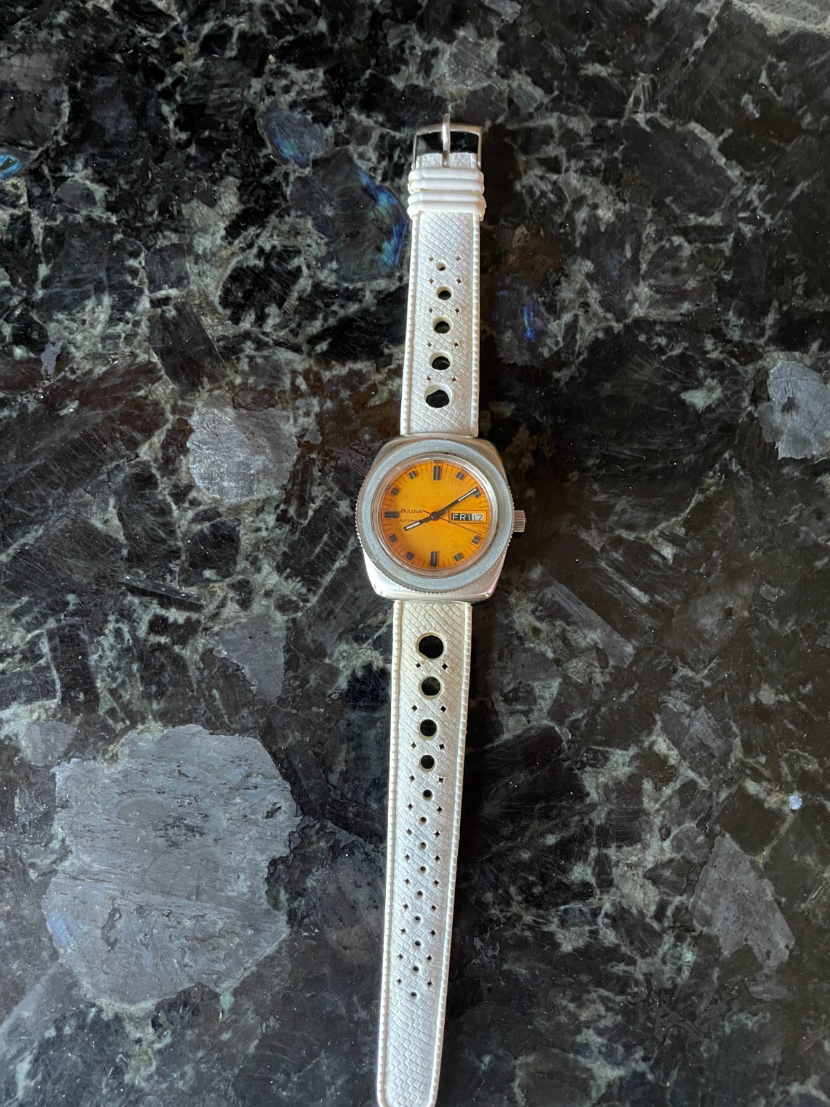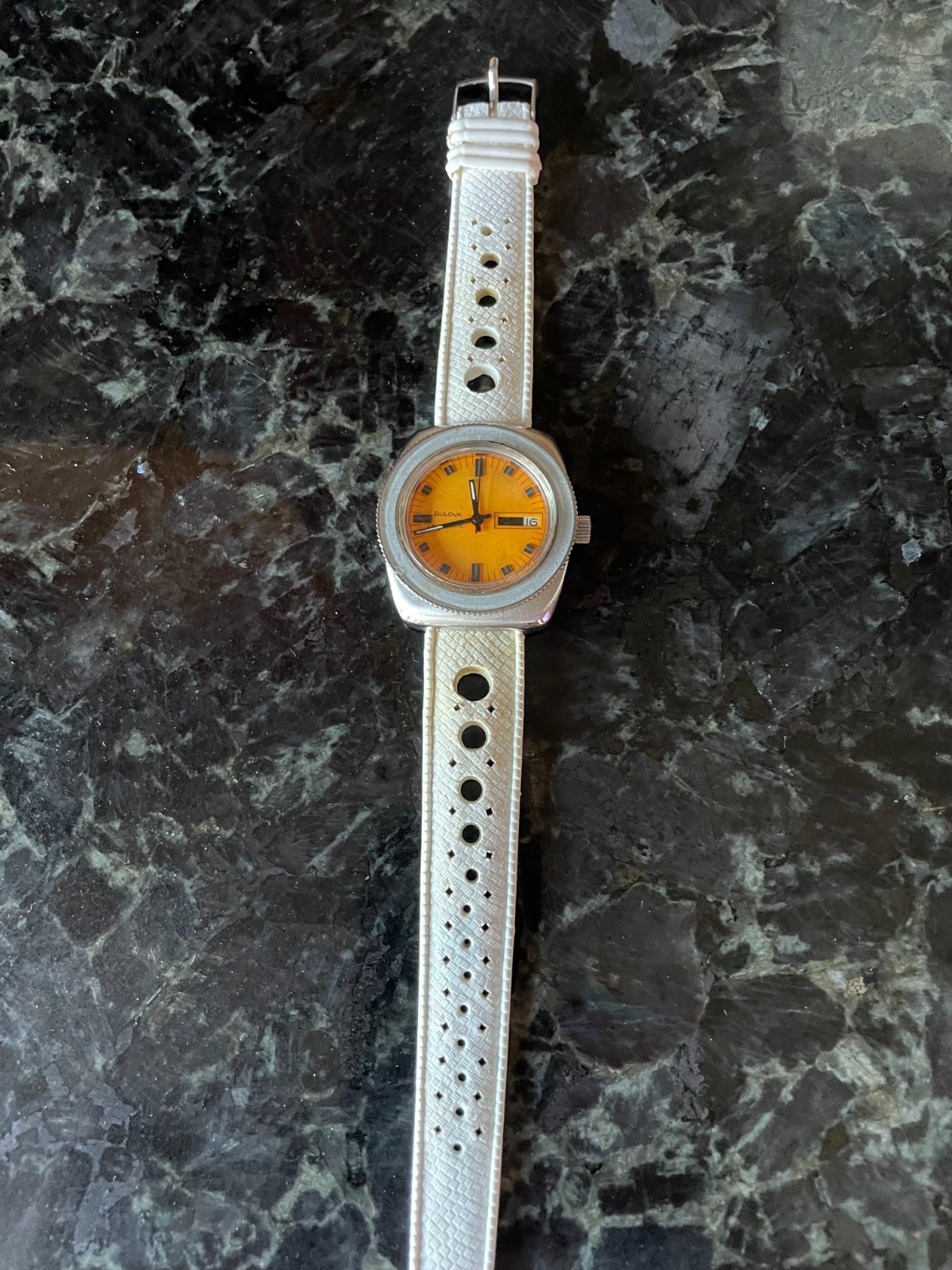 Rare Vintage Bulova SkyStar from 1969. Only made for one year, with approximately 3,000 orange versions ever made. It keeps great time and has an excellent wrist presence. Day and date advance as they should. Hands look to be relumed.